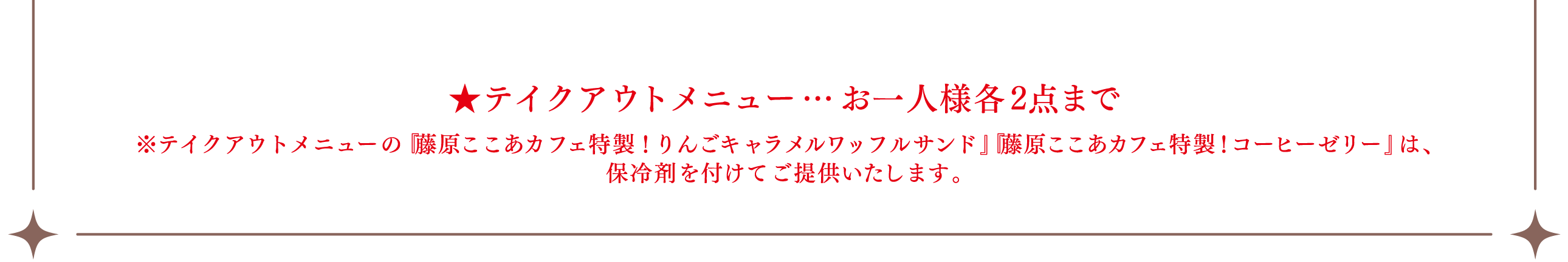 ※1回のご注文でオーダーいただけるメニューの数量に制限をかける場合がございます。また、制限の数は会期前・会期中に関わらず、予告なく変更になる場合がございます。